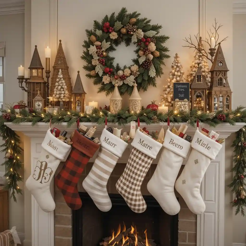 Add monogrammed stockings or wooden name tags for a personal farmhouse touch. It makes your Christmas mantle feel warm and meaningfulChristmas Mantle Décor Ideas