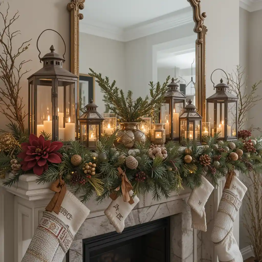 Place metal or wooden lanterns filled with candles along the mantle. Their soft glow adds cozy charm and pairs beautifully with greenery. Christmas Mantle Décor Ideas
