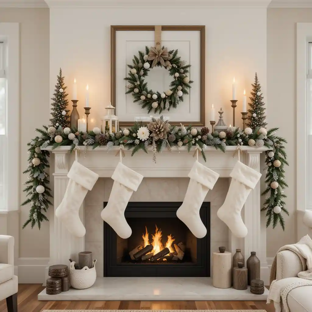 Keep it simple with cream-colored stockings, wooden accents, and soft greenery. The neutral palette makes the mantle look modern yet inviting. Christmas Mantle Décor Ideas