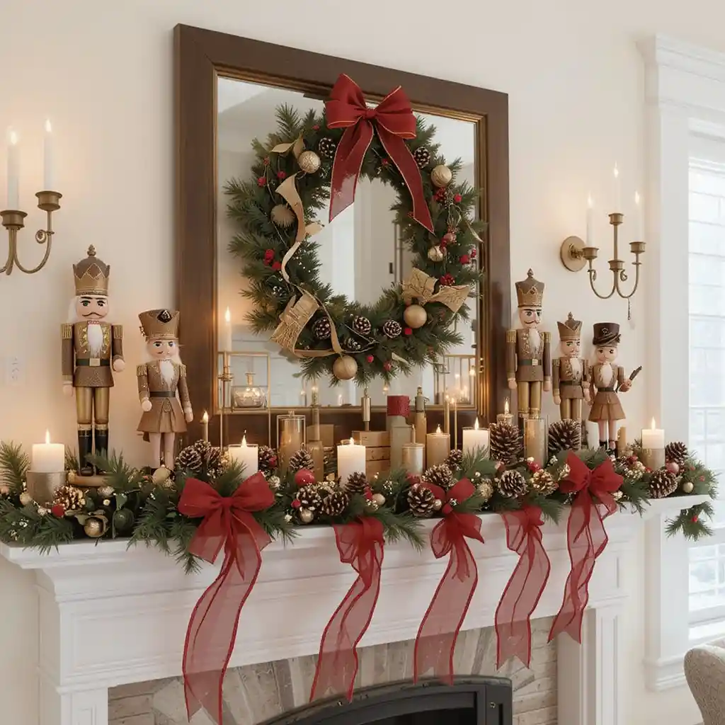 Add nutcracker figurines of different sizes to your mantle. Pair them with pinecones and ribbons for a nostalgic, festive display.