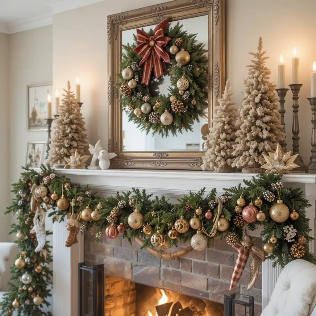 Use gold ornaments, ribbons, and candle holders for a glamorous holiday mantle. The metallic tones reflect light and bring elegance to the room.