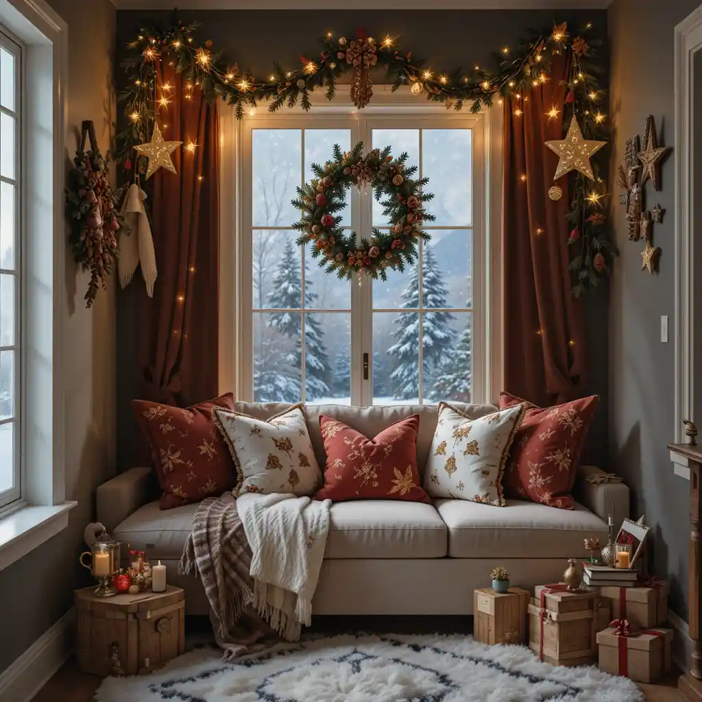 Frame your nook window with garlands and fairy lights. This makes the space glow beautifully during the evening. Christmas Nook Decor