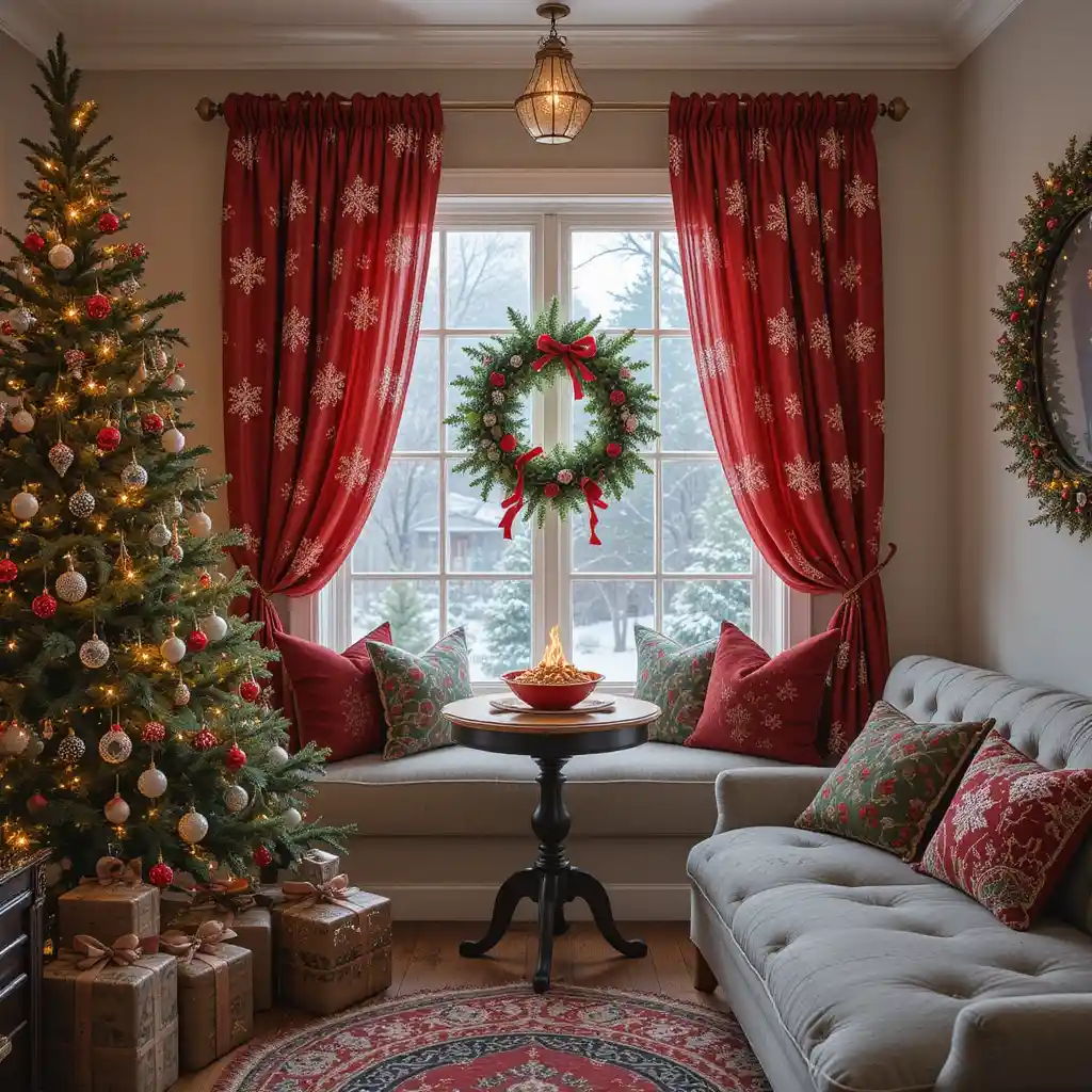 Switch regular curtains for red, green, or snowflake-patterned drapes. This simple swap gives instant Christmas charm.