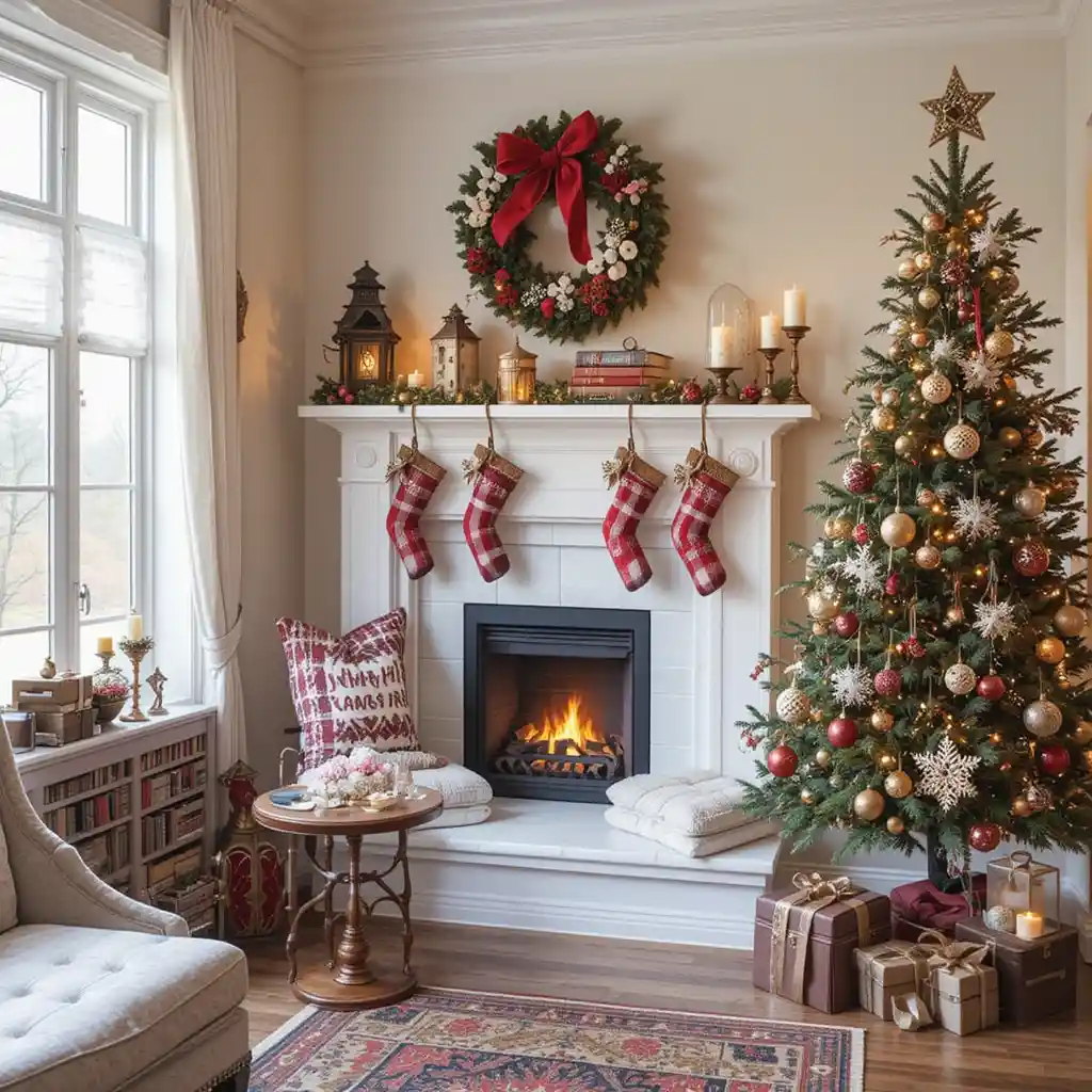 Place a small electric fireplace or faux fire lanterns nearby. This adds warmth and creates a classic holiday mood.