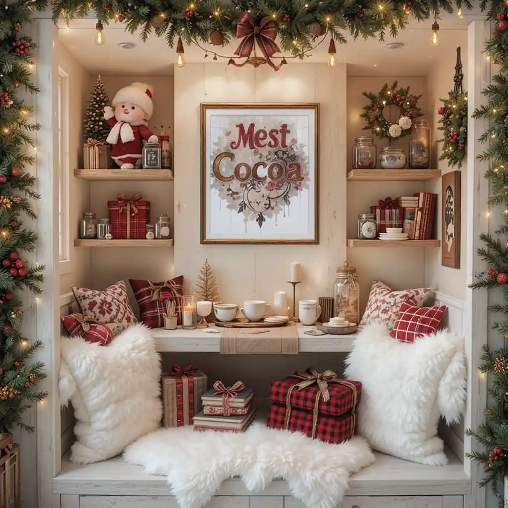 Turn a nook into a hot cocoa bar with mugs, jars, and fairy lights. It’s cozy and perfect for family gatherings. Christmas Nook Decor