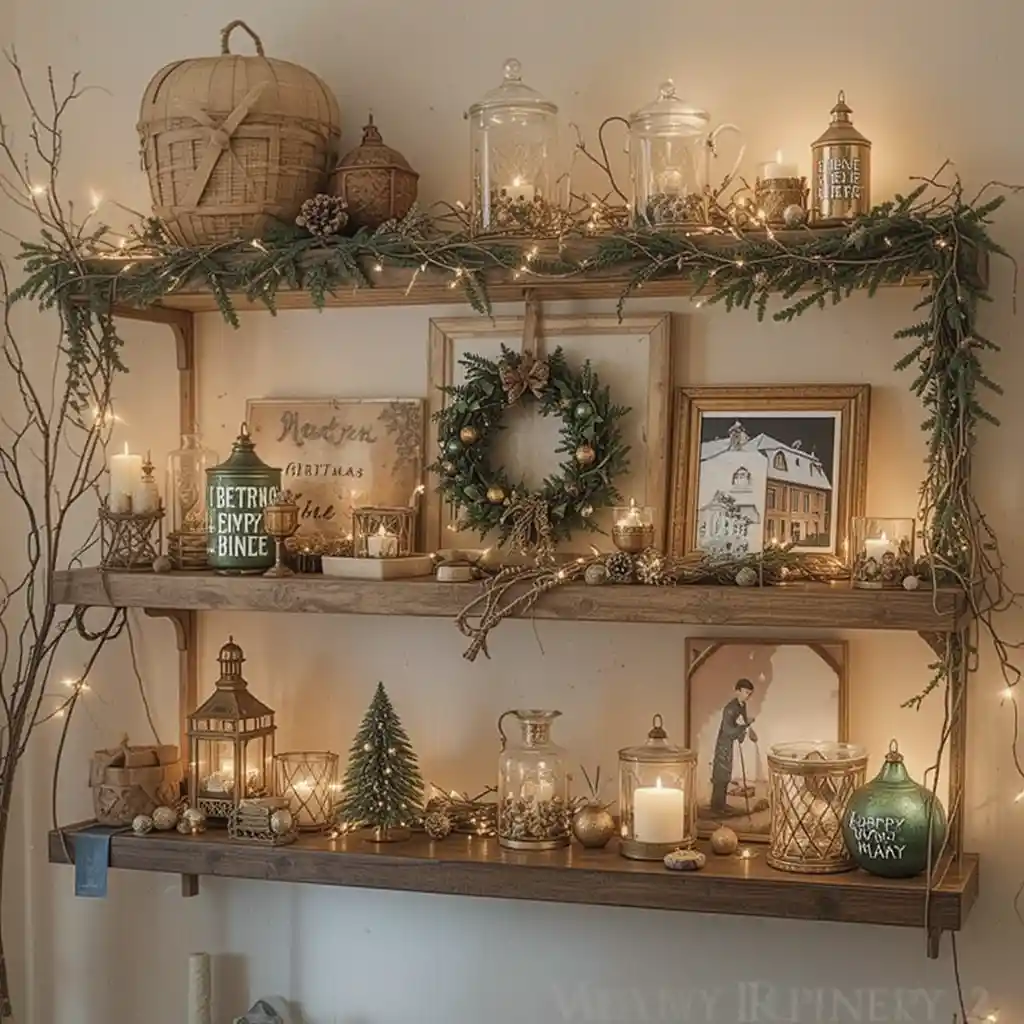 Decorate shelves with ornaments, mini wreaths, and fairy lights for a layered and festive arrangement that enhances your space.