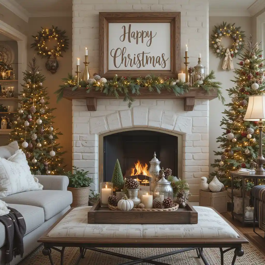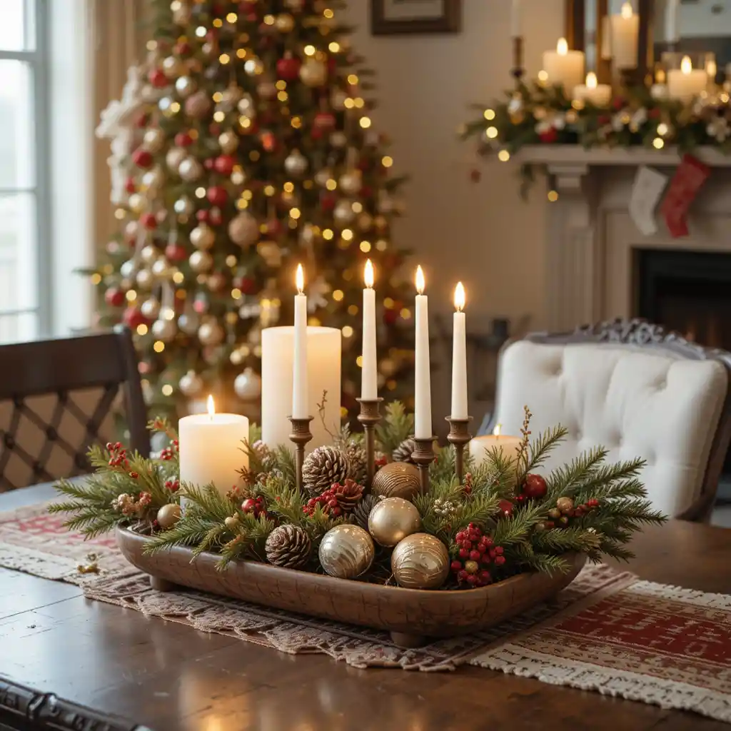 Create centerpieces with pine branches, candles, and ornaments for dining or coffee tables to enhance your Christmas vibe.