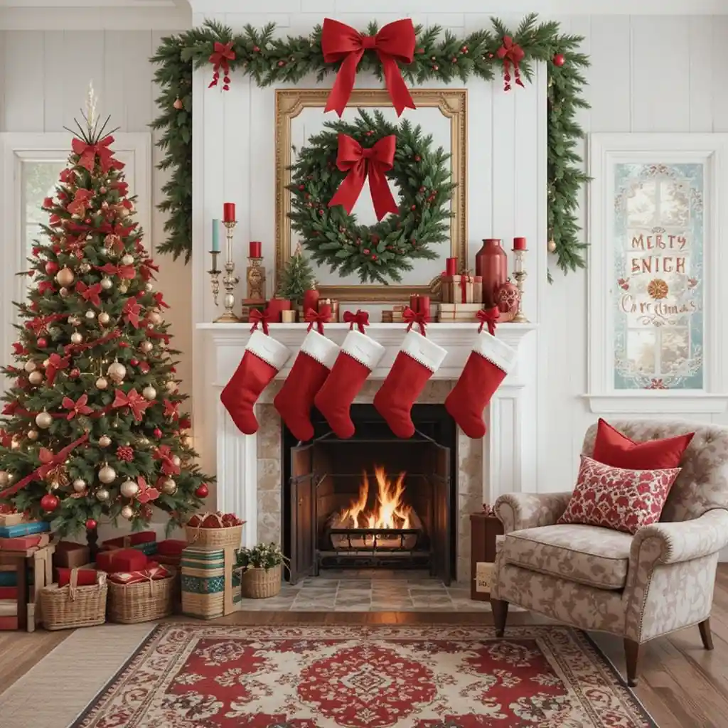 Use burlap ribbons, wooden accents, and plaid details. This style combines simplicity and coziness for a warm farmhouse holiday vibe.