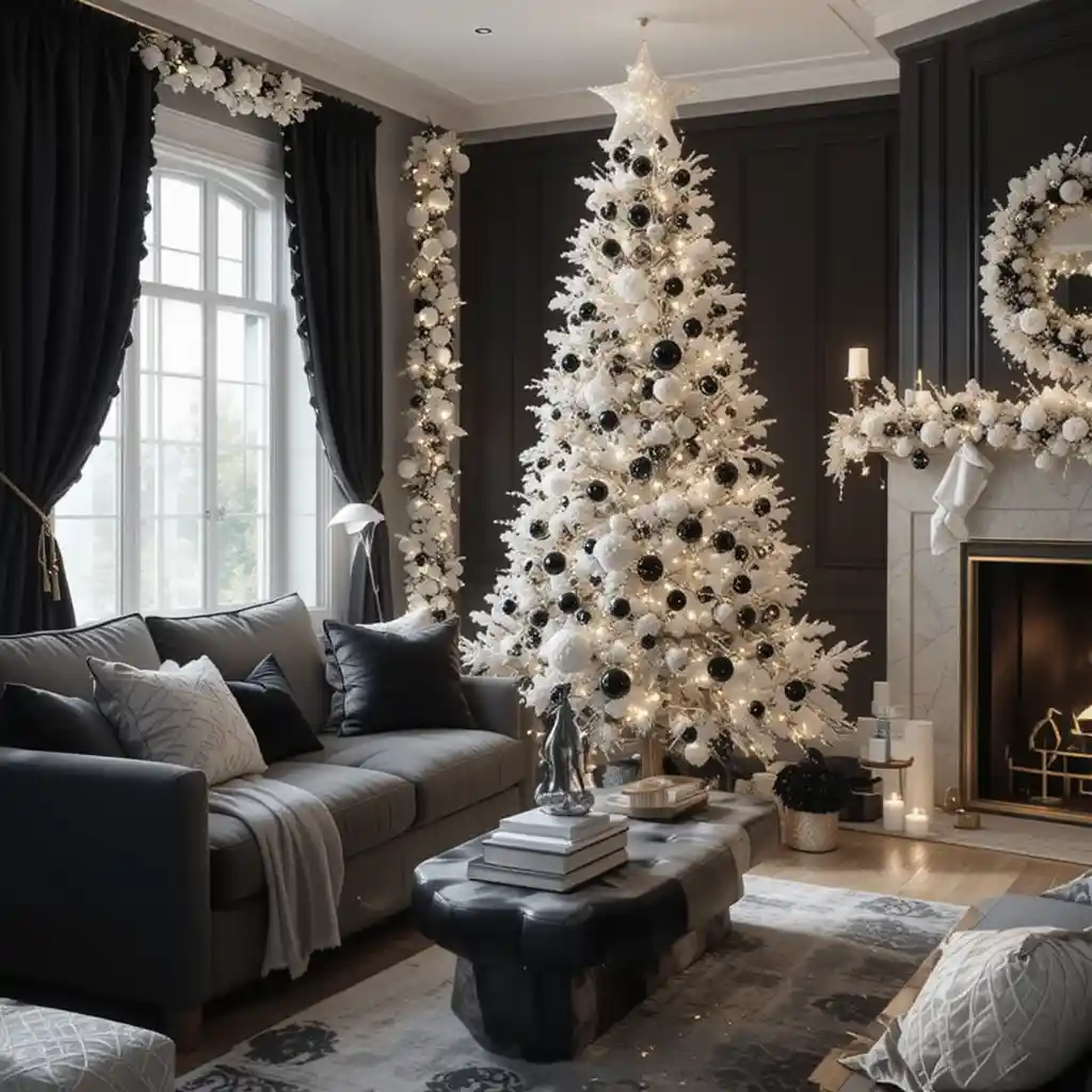 Use black ornaments, white garlands, and silver details. This modern design is bold, stylish, and adds a contemporary edge.