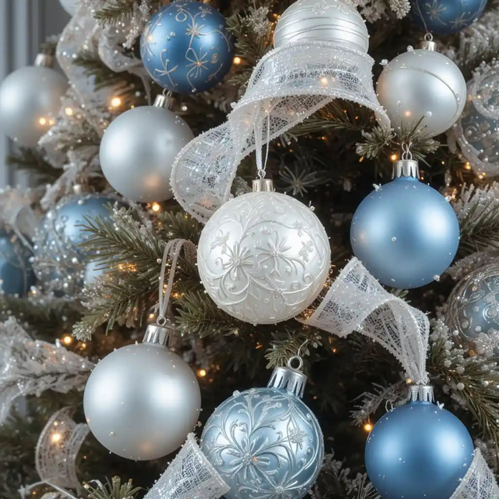Pair icy blue ornaments with shimmering silver ribbons. This combination feels crisp, elegant, and perfect for a wintry holiday setting.