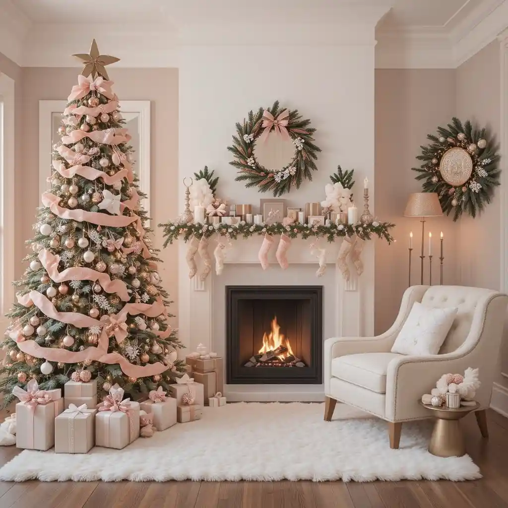 Adorn your home with rose gold ornaments, blush ribbons, and glittery accents. This feminine theme sparkles with modern elegance.