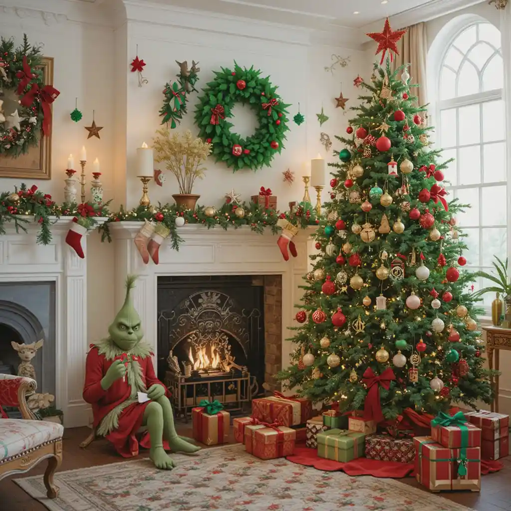 Add whimsical green and red decorations with quirky shapes. A Grinch-themed Christmas is playful, fun, and full of character.