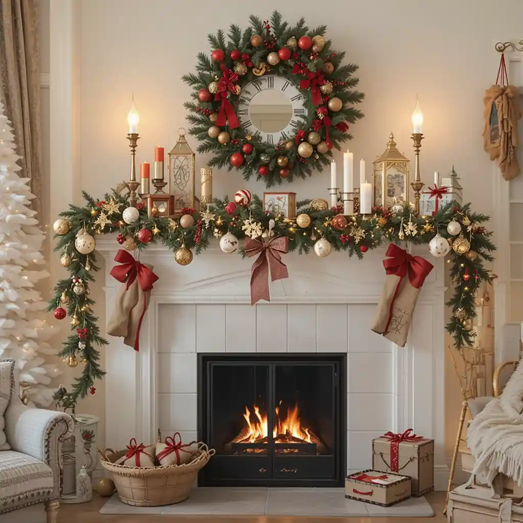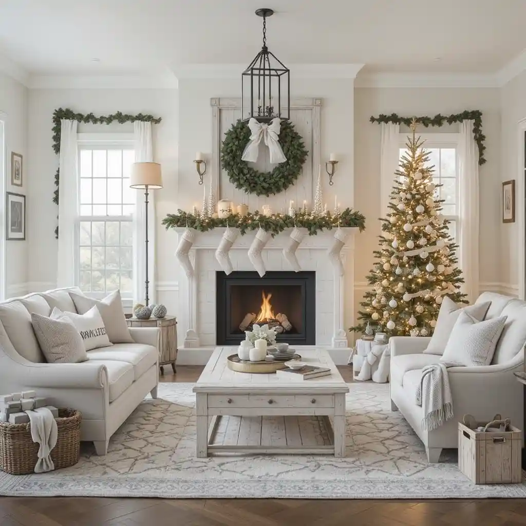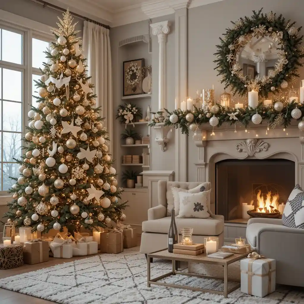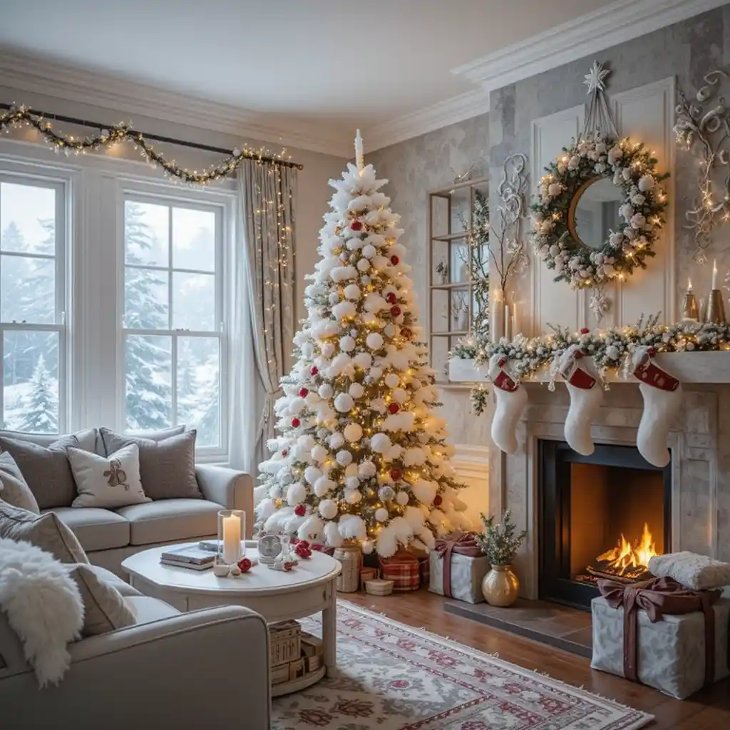Create a snowy atmosphere with white ornaments, frosted garlands, and silver accents. The icy palette makes your space feel magical and serene.