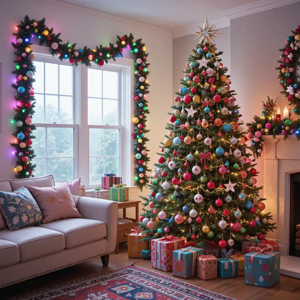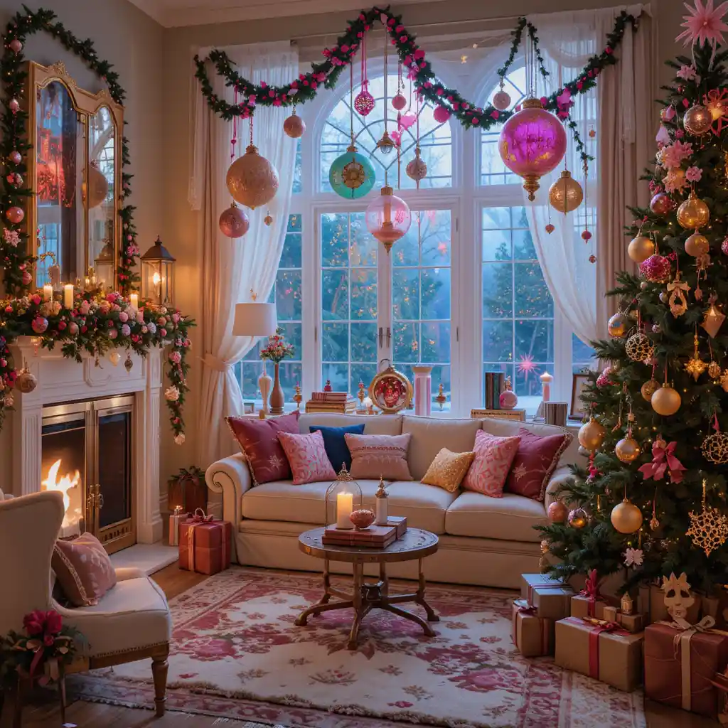 Add fairy lights, oversized ornaments, and colorful garlands. This magical style feels playful and dreamlike, perfect for a bold holiday setup. Christmas Themes Decoration