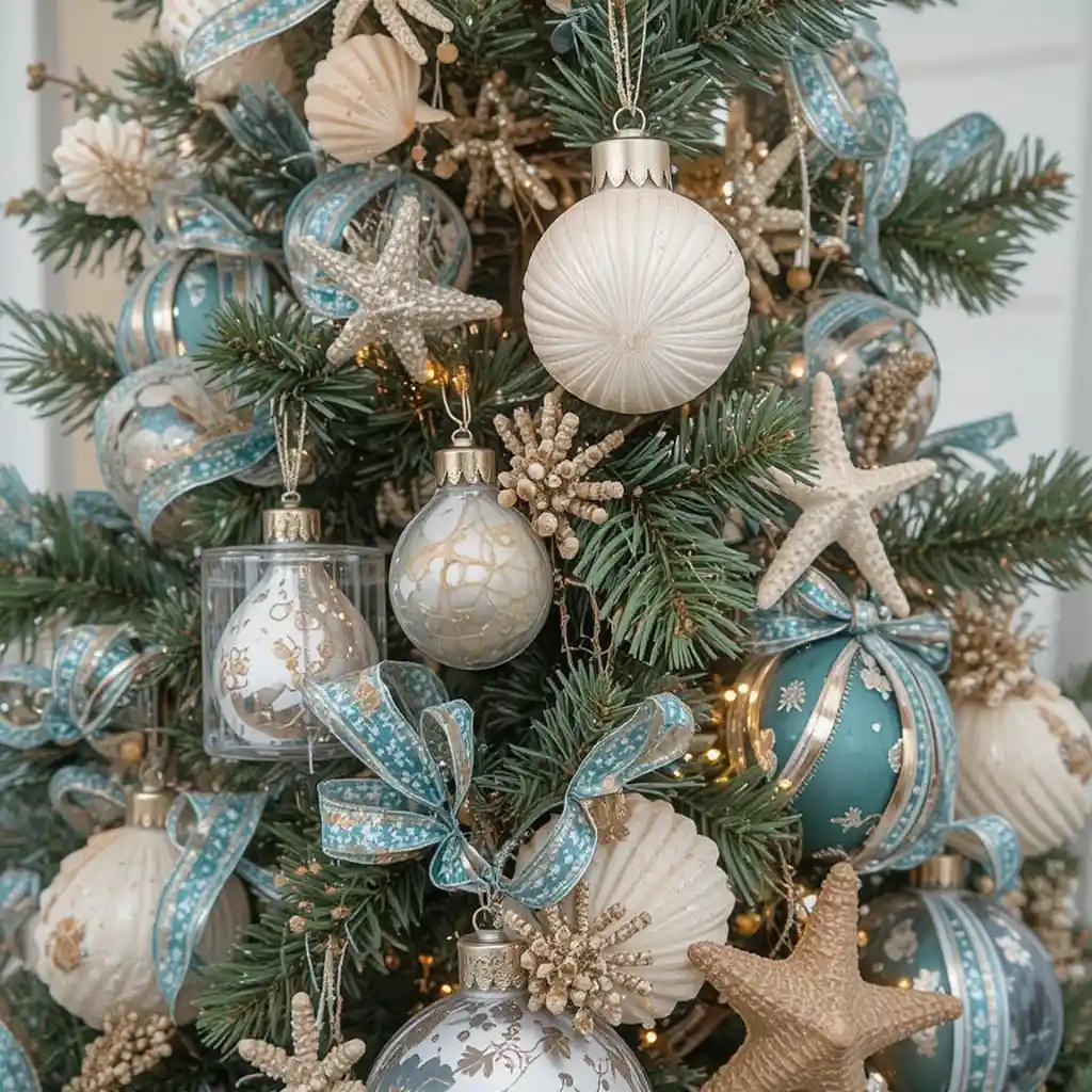 Bring the beach to your home with seashell ornaments, starfish details, and turquoise ribbons. It’s a refreshing twist that feels unique and cheerful.