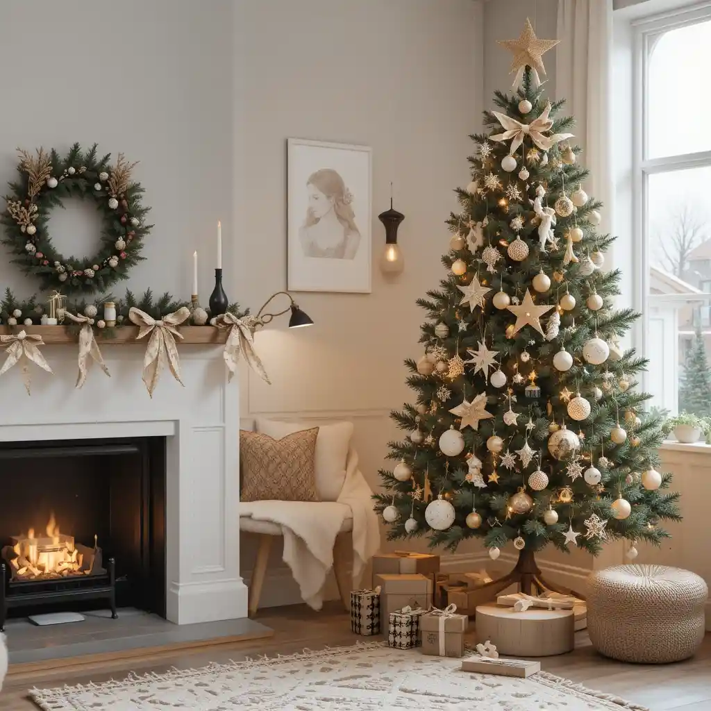 Choose wooden ornaments, paper stars, and neutral colors. The Scandinavian style feels cozy yet modern with a touch of simplicity.