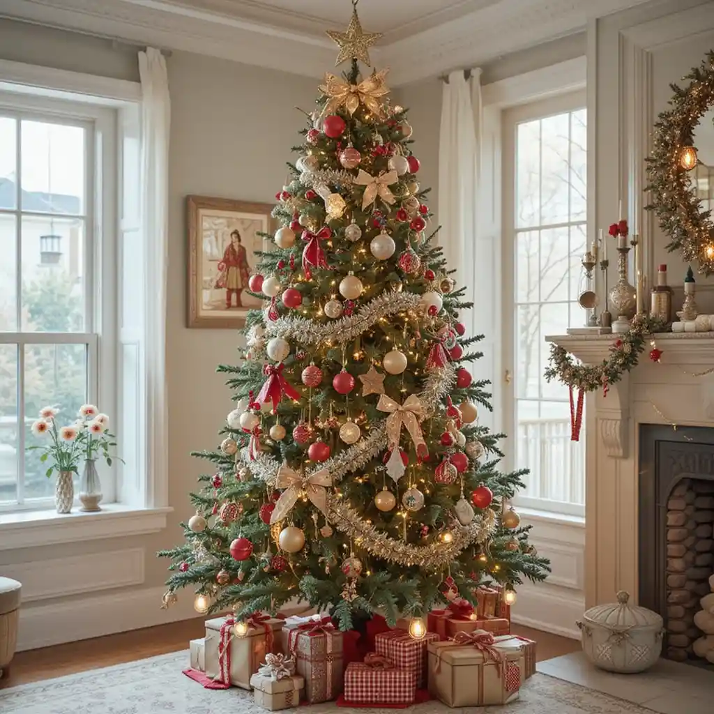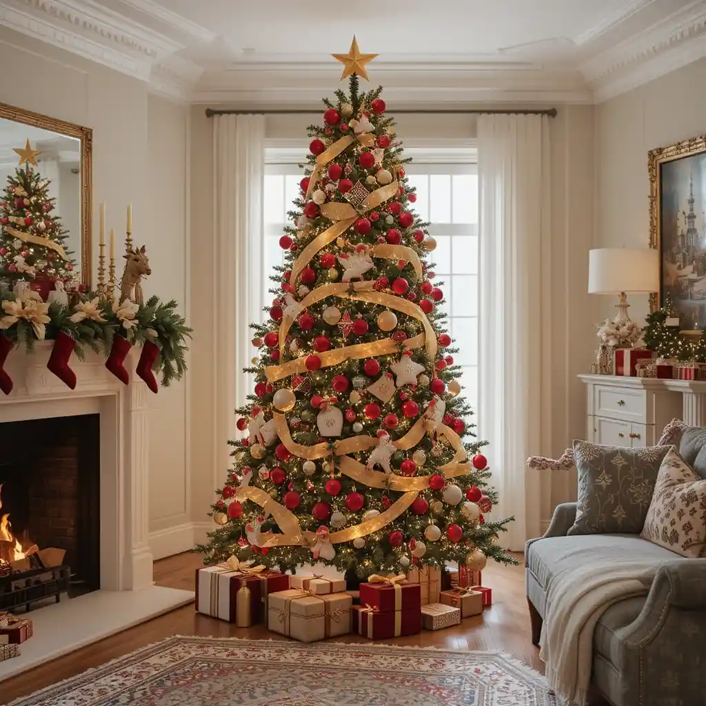 Dress your tree with red ornaments, gold ribbons, and twinkling lights for a timeless look. This style creates a rich, elegant holiday vibe that never goes out of style.