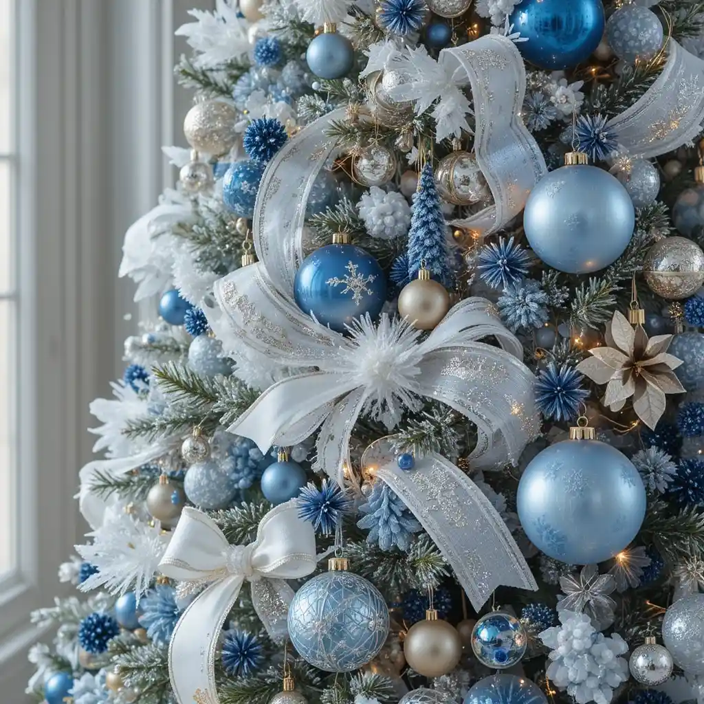 Mix icy blue baubles, silver ribbons, and crystal ornaments. The frosty color scheme feels cool and elegant, creating a dreamy winter scene.