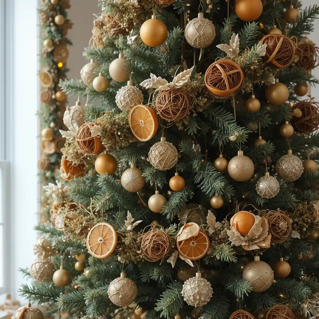 Use dried orange slices, cinnamon sticks, and natural garlands. These earthy details add fragrance and rustic charm while keeping the design organic.