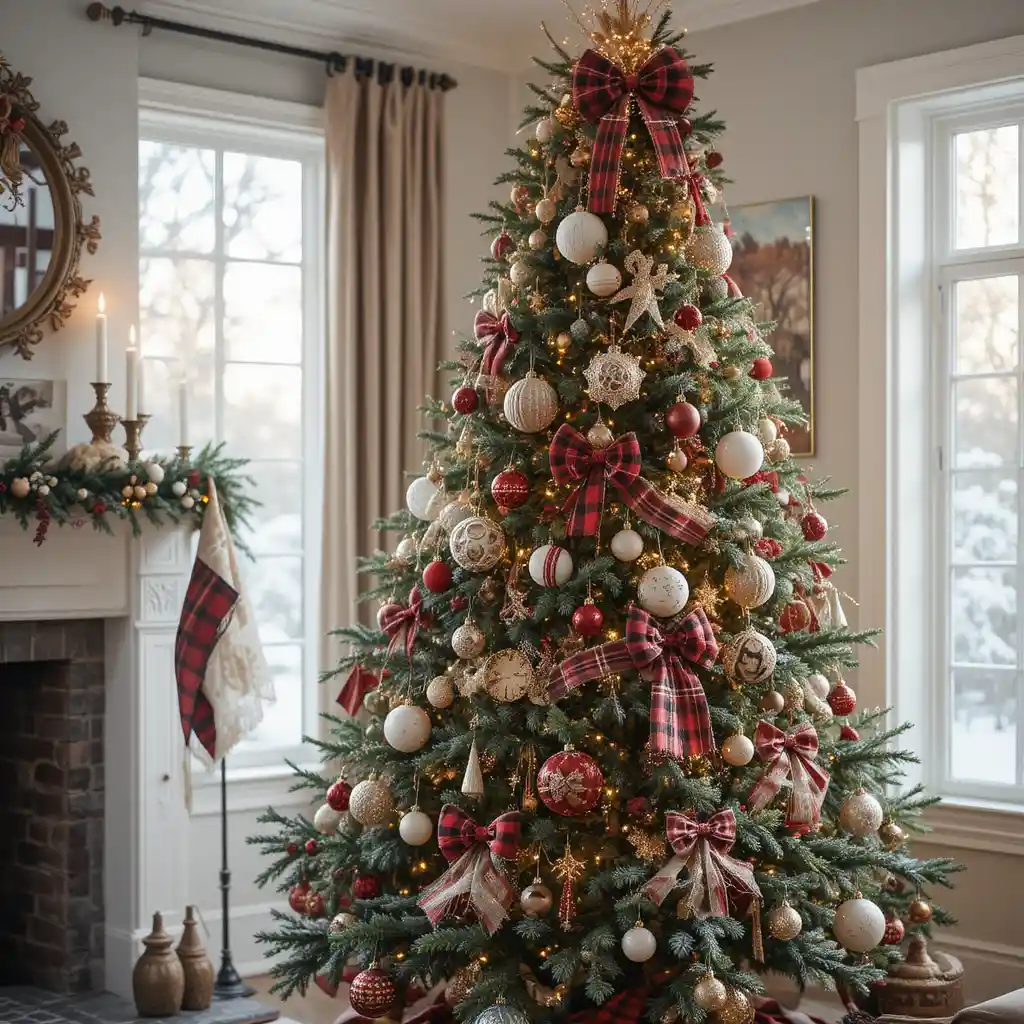 Incorporate plaid ribbons, flannel bows, and knitted ornaments. This look adds warmth and comfort, creating the perfect cozy holiday vibe.
