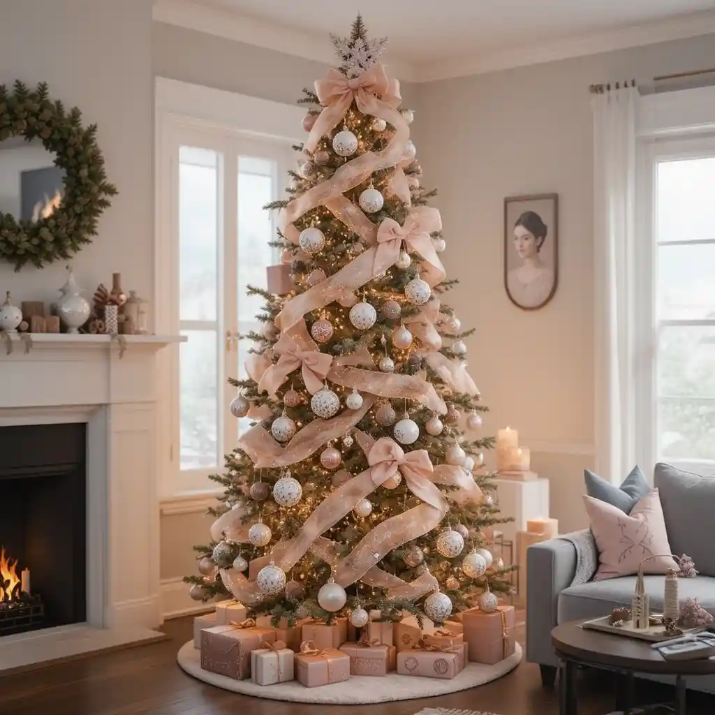 Adorn the branches with rose gold baubles, blush pink ribbons, and glitter ornaments. This modern yet feminine look adds sparkle and elegance.