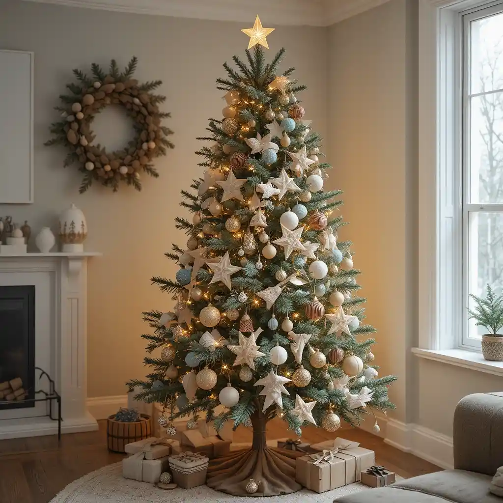 Keep it simple with wooden ornaments, paper stars, and white lights. The Nordic-inspired look feels minimalist yet warm and stylish.