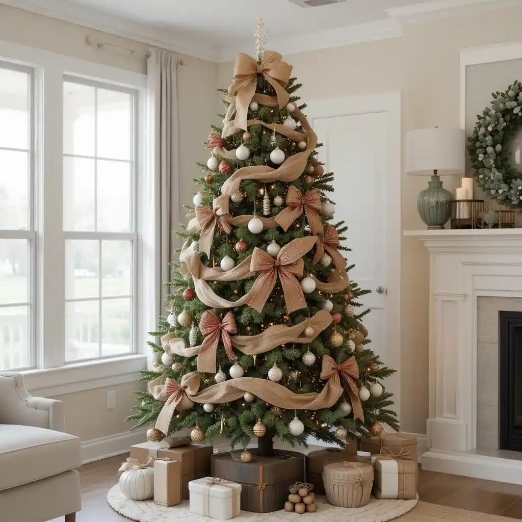 Add burlap ribbons, wooden ornaments, and plaid bows. The mix of natural textures and warm tones makes the tree cozy and inviting, perfect for farmhouse-inspired homes.