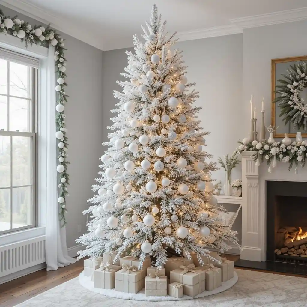 Choose a flocked Christmas tree with soft lights and frosted ornaments. This style gives the illusion of snow-covered branches for a cozy alpine vibe.