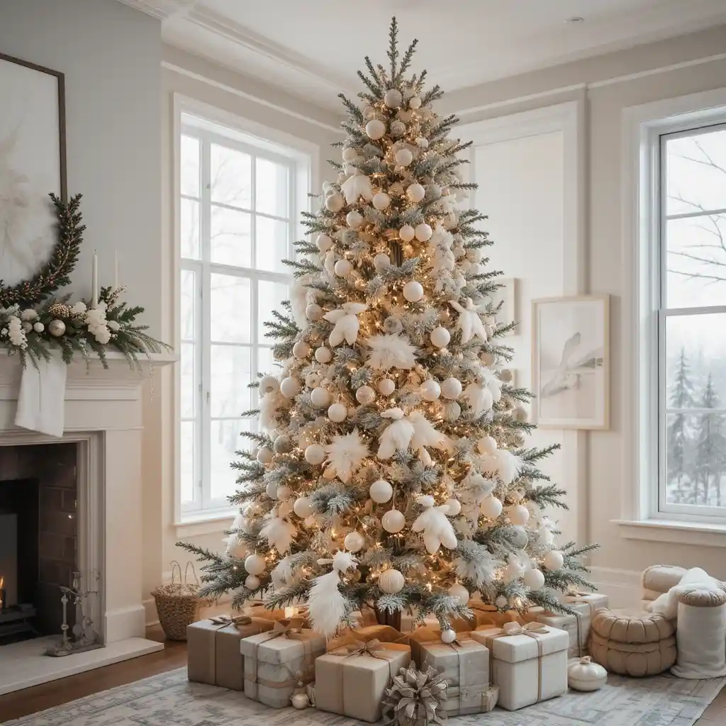 Use white ornaments, flocked branches, and snowflake garlands. This icy theme creates a peaceful and magical winter effect that feels like freshly fallen snow indoors.