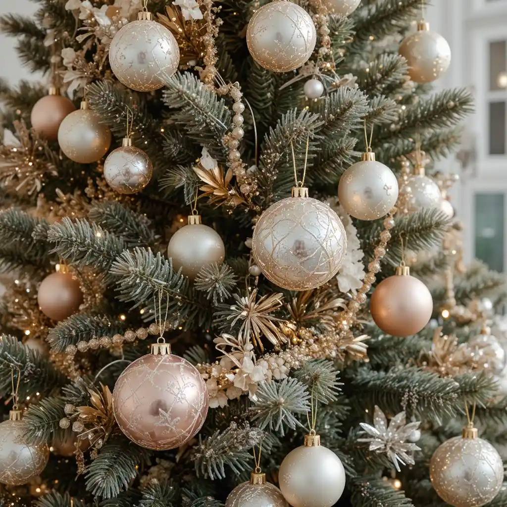 Fill the branches with silver, rose gold, and champagne ornaments. Metallic hues make the tree sparkle beautifully under the lights for a glamorous touch.