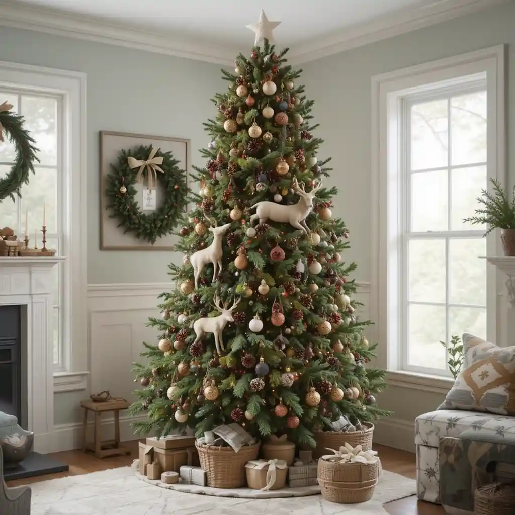 Add pinecones, woodland animal ornaments, and earthy greens. This natural design feels rustic and outdoorsy while still cozy indoors.