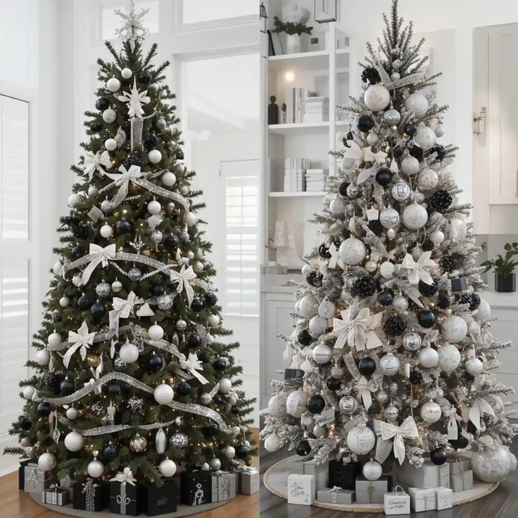 Combine black ornaments, white ribbons, and silver accents. The bold contrast creates a sophisticated and modern look that stands out beautifully.