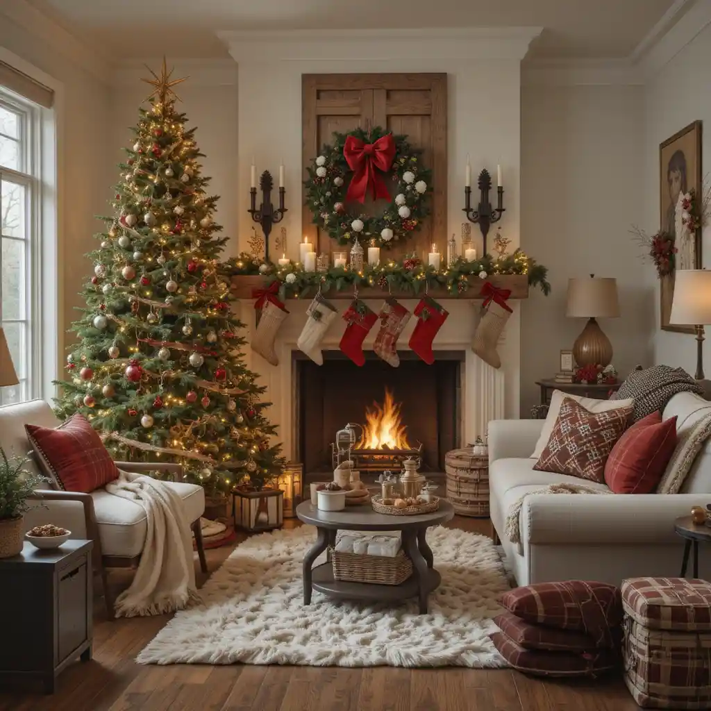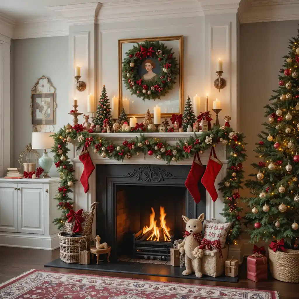 The fireplace mantel becomes a centerpiece with layered garlands, twinkling candles, and seasonal figurines, giving living rooms a warm festive glow.
