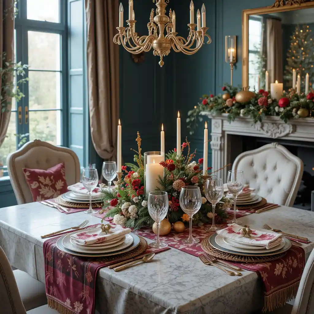Dining rooms in 2025 are decorated with layered table runners, elegant chargers, crystal glasses, and festive centerpieces, turning meals into holiday experiences.