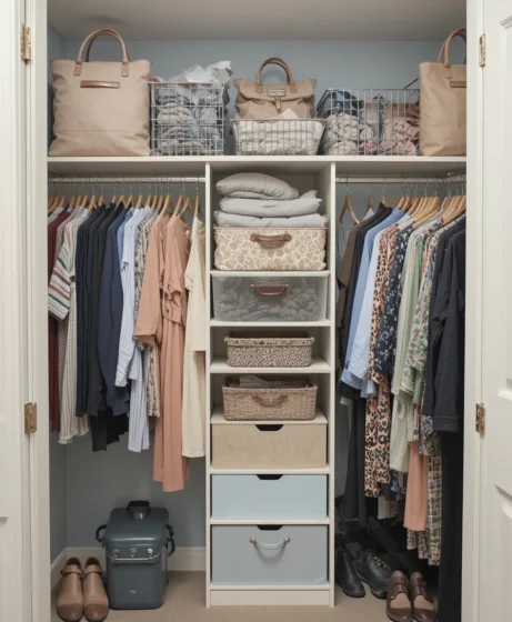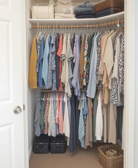 Storing off-season clothing elsewhere creates breathing room. This simple habit keeps your closet focused on what you actually wear, making it feel more organized instantly.