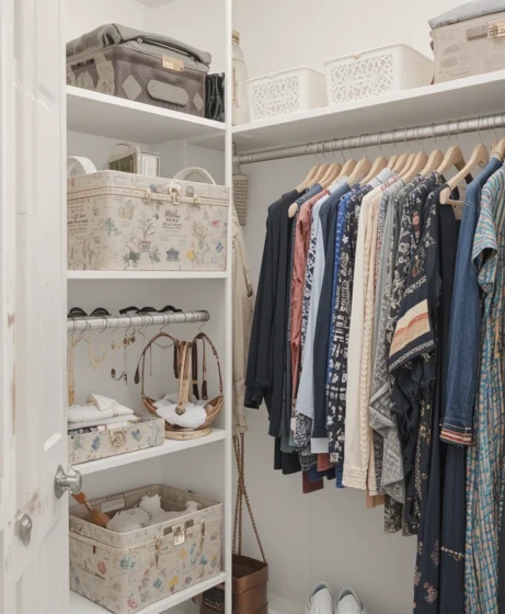 Baskets add warmth while hiding clutter. They’re ideal for scarves, hats, or casual items and work well on shelves where rigid bins may feel too harsh.