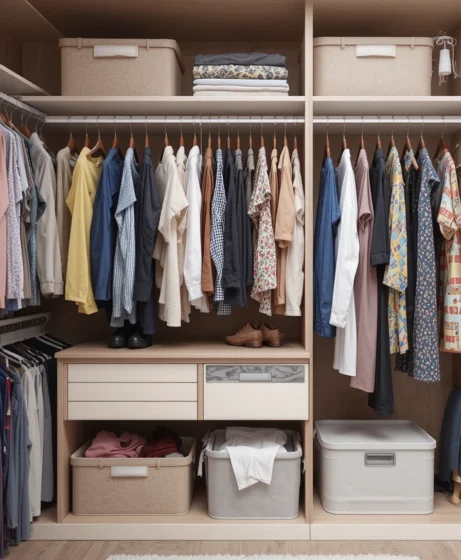 Most closets waste space above eye level. Adding upper shelves or stackable organizers allows you to store seasonal clothing, bags, or bins neatly. This idea keeps everyday items within reach while maximizing unused vertical areas Closet Organization Ideas.