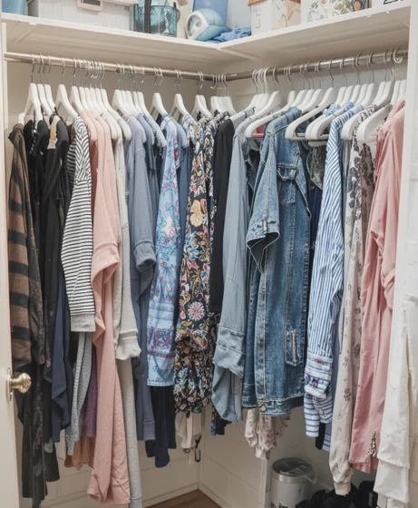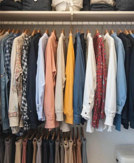 Arranging clothes by color adds visual calm and speeds up outfit selection. This method works especially well for shirts, dresses, and jackets.