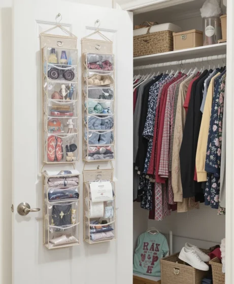 Over-the-door organizers are perfect for shoes, accessories, or cleaning items. This often-forgotten space adds storage without taking up room inside the closet.