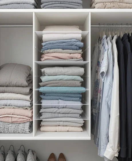 Folded clothes tend to collapse over time. Shelf dividers keep stacks separated and upright, making it easier to grab items without disturbing the rest of your Closet Organization Ideas.