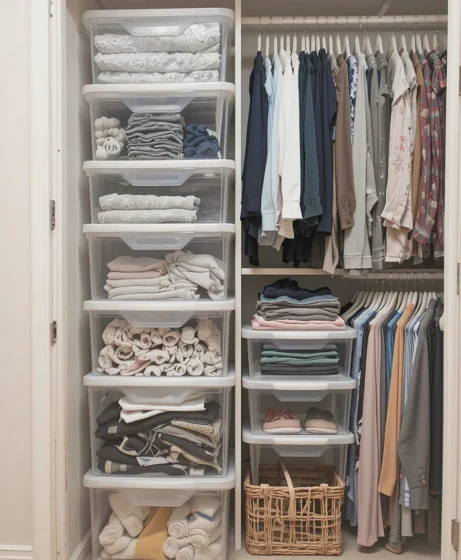 Clear bins allow you to see what’s inside at a glance. They’re perfect for accessories, workout gear, or off-season items, helping you stay organized without opening multiple containers.