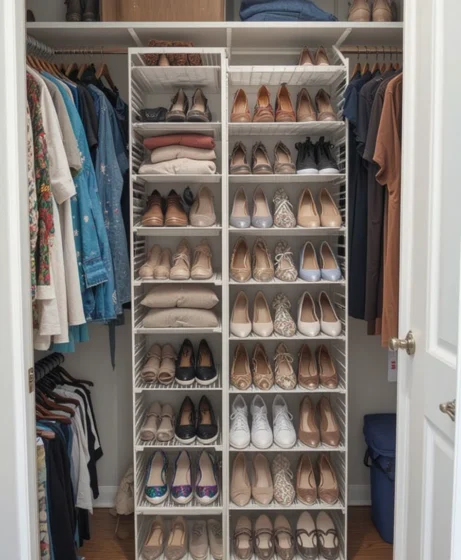 A dedicated shoe rack keeps footwear off the floor and neatly arranged. Vertical or over-the-door shoe organizers are especially useful for keeping small closets clutter-free Closet Organization Ideas.