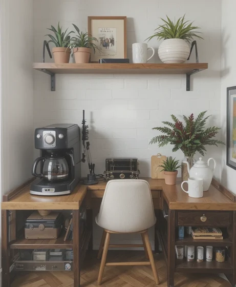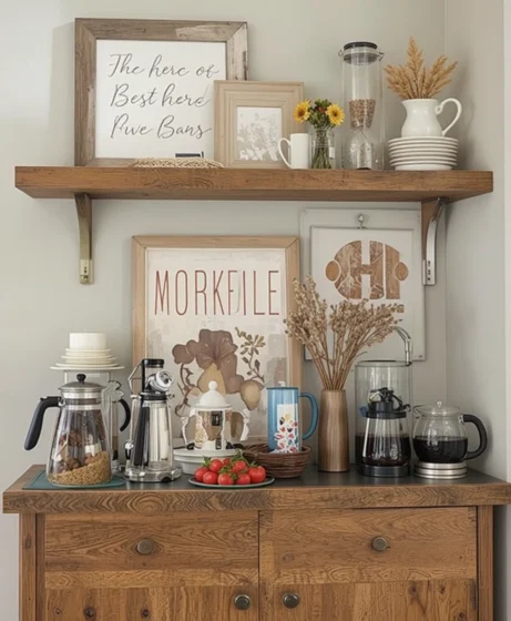 Corners are often overlooked, but they’re perfect for a coffee bar. Add corner shelves or a small table to turn unused space into a cozy coffee station that feels intentional and inviting Coffee Bar Ideas.