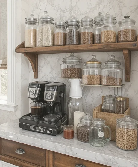 Clear jars for beans, sugar, and pods add organization and visual appeal. This idea keeps supplies fresh while making the coffee bar look clean and intentional.