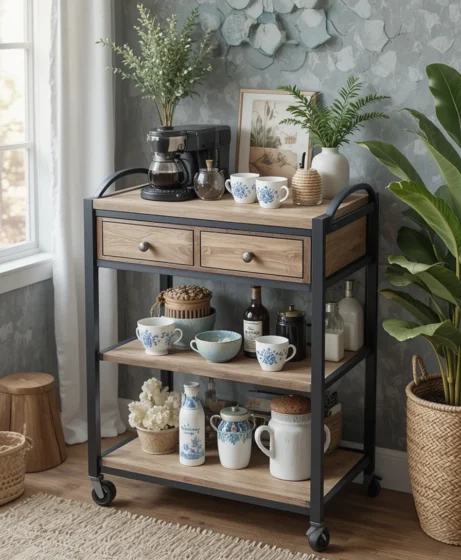 A rolling coffee bar cart gives you flexibility. You can move it from the kitchen to the living room or even outside. This idea is great for entertaining and for homes where layouts change often Coffee Bar Ideas.