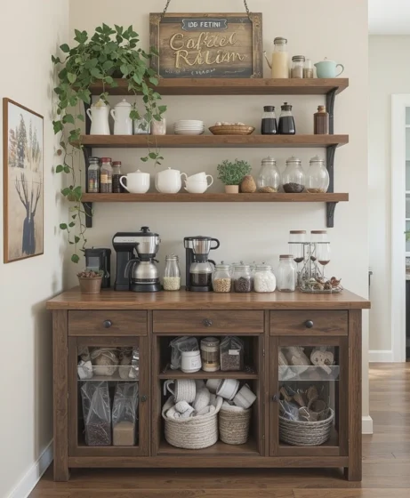 Open shelves allow you to show off your mugs, jars, and coffee tools. This idea works best when items are organized and color-coordinated, turning everyday essentials into décor.