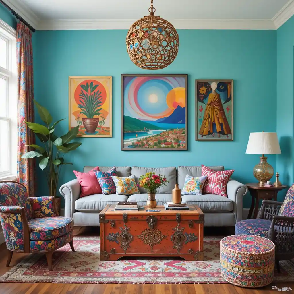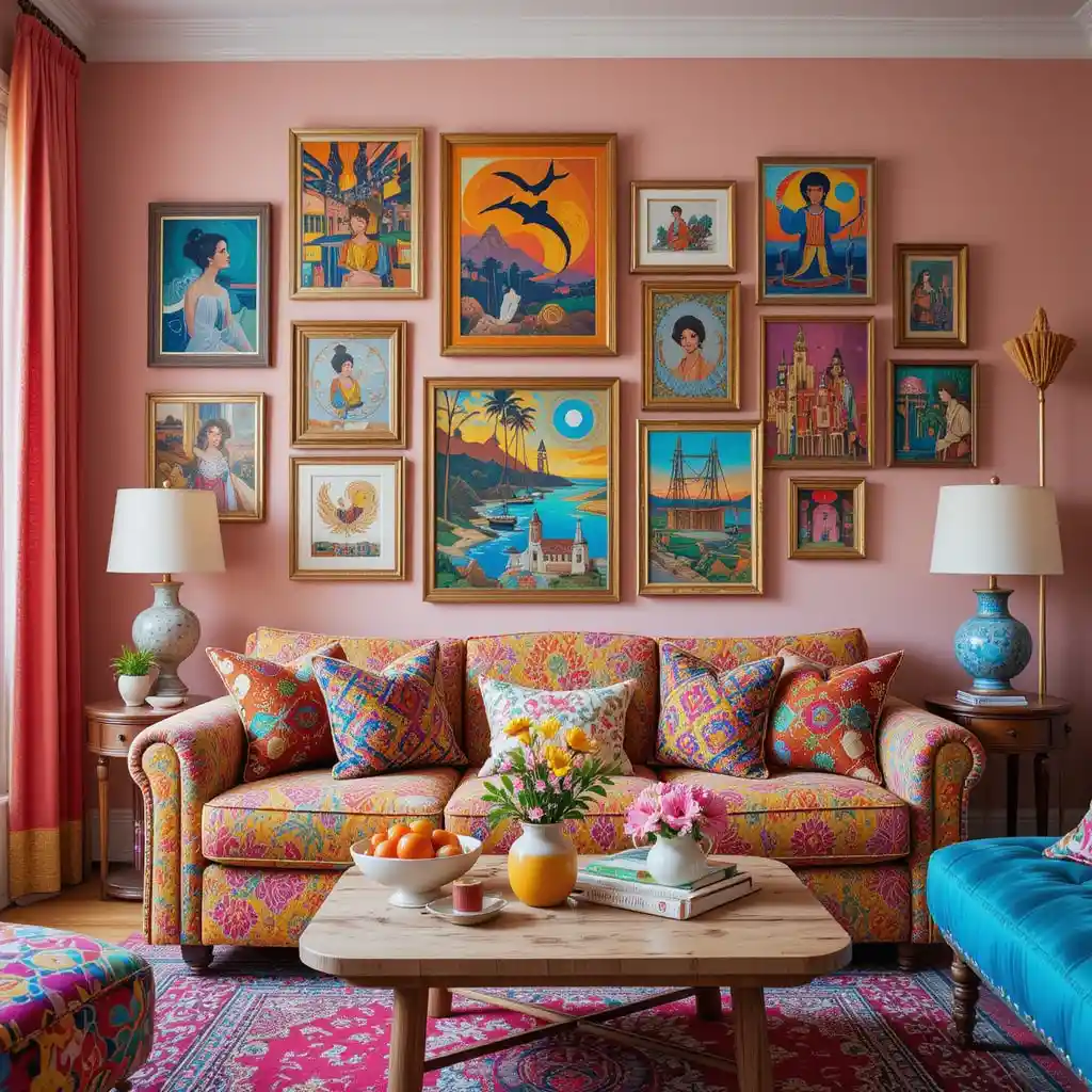 Curate a gallery wall using art pieces in vivid colors, travel-inspired themes, or handmade crafts for personality and visual excitement.