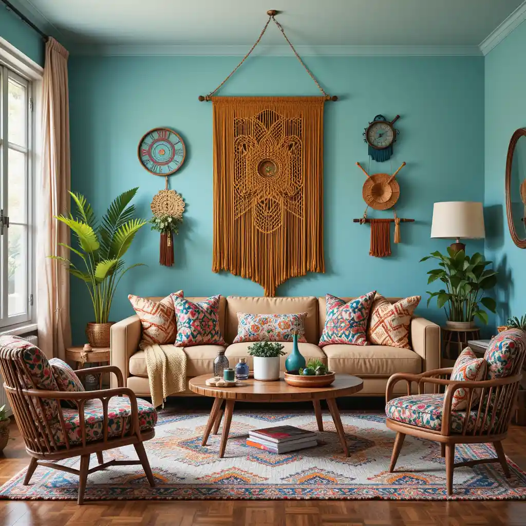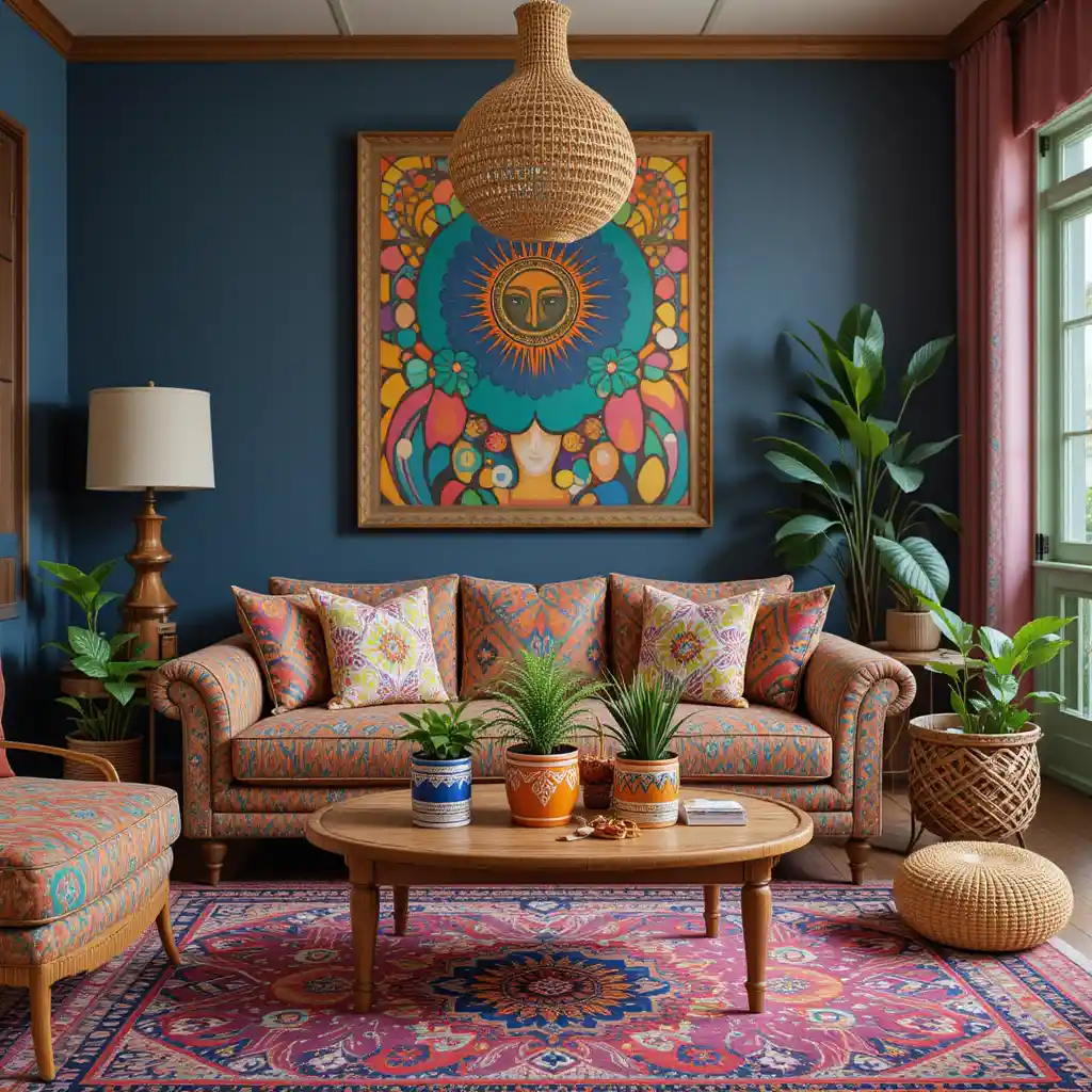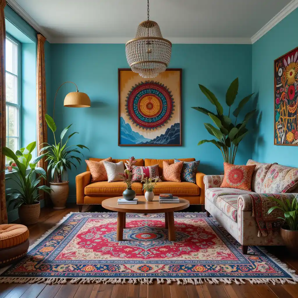 Choose a rug with bold reds, blues, or oranges and geometric patterns to ground the room and set a playful boho tone from the floor up.