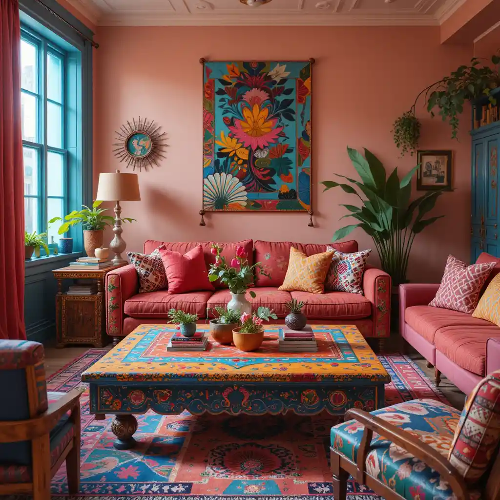 Look for a hand-painted or inlaid wooden coffee table in bright hues to act as a centerpiece with ethnic charm and function.