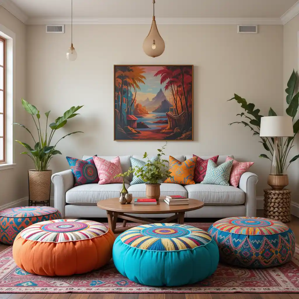 Use large poufs or floor cushions in mixed prints for casual seating that’s perfect for lounging and gives your room a laid-back feel.